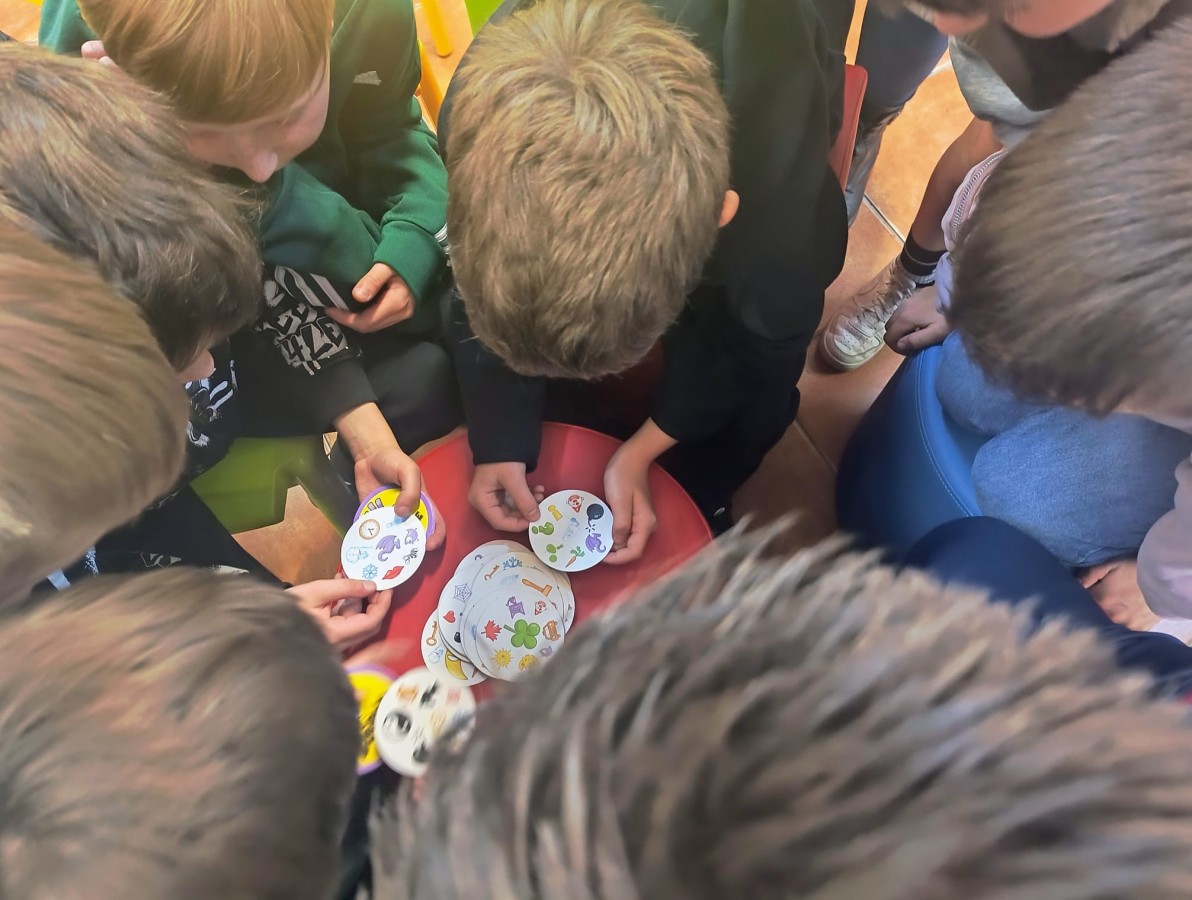 Spotkanie rozpoczęła rozgrzewka integracyjna „Mina jak z filmu” – dzieci losowały karteczki z emocjami (radość, zdziwienie, zaskoczenie) i przedstawiały je bez użycia słów.